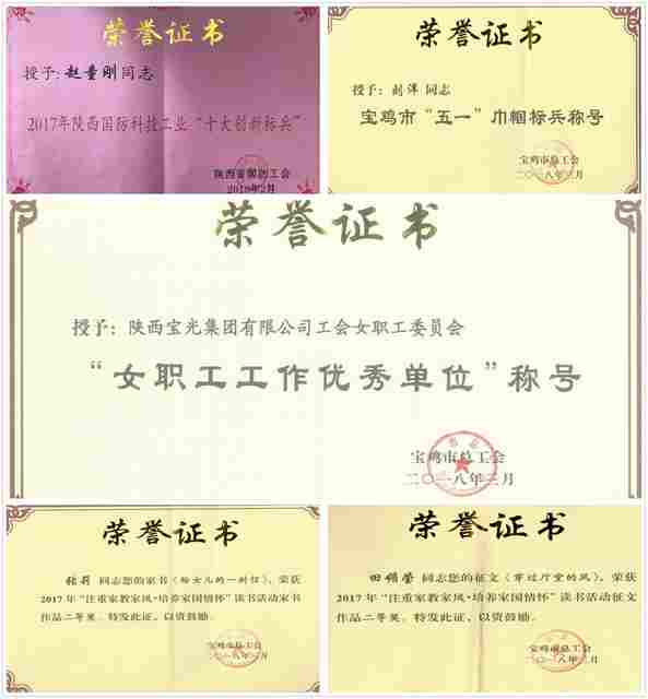 寶光集團女工委榮獲寶雞市總工會女職工工作優(yōu)秀單位;精密陶瓷公司趙童剛同志榮獲陜西省國防科技工業(yè)“十大”創(chuàng)新標兵;進出口公司劉洋同志榮獲寶雞市“五一”巾幗標兵;C產(chǎn)品制造部田媚瑩同志在寶雞市“注重家教家風 培養(yǎng)家國情懷”讀書征文活動中榮獲二等獎;A產(chǎn)品制造部張莉同志在寶雞市讀書活動中榮獲家書作品二等獎。